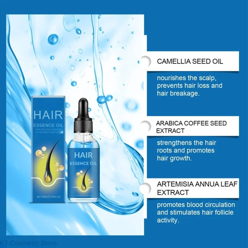 Hair Essence Growth Oil blends nature and science to support healthy hair and scalp. Camellia Seed Oil nourishes and strengthens strands, Coffee Seed Extract stimulates dormant follicles, and Artemisia Annua Leaf Extract soothes and protects the scalp. Ginger Root Extract boosts circulation, while Vitamin E and Hyaluronic Acid hydrate and improve follicle health. Together, these ingredients help restore thinning hair, reinforce roots, and promote fuller, healthier growth.